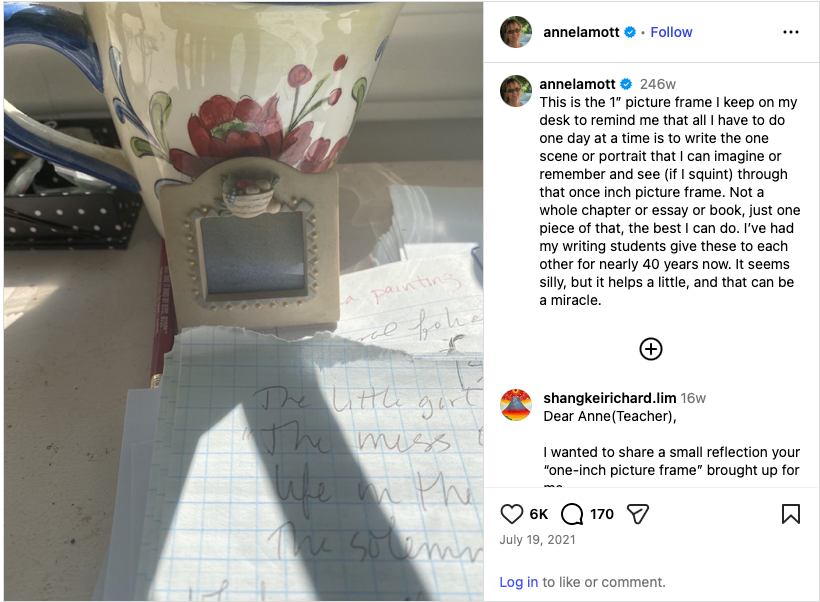 Anne Lamott keeps a one inch picture frame on her desk as a way of focusing on one next scene or portrait: