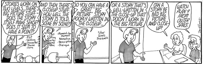 David Lee Finkle uses the mental model of thinking about stories either in Big Picture or Close Up. By keeping things in the Close Up view, writers are able to focus on the immediate moment they're writing instead of juggling thematic concerns or information about every step in a plot thread.