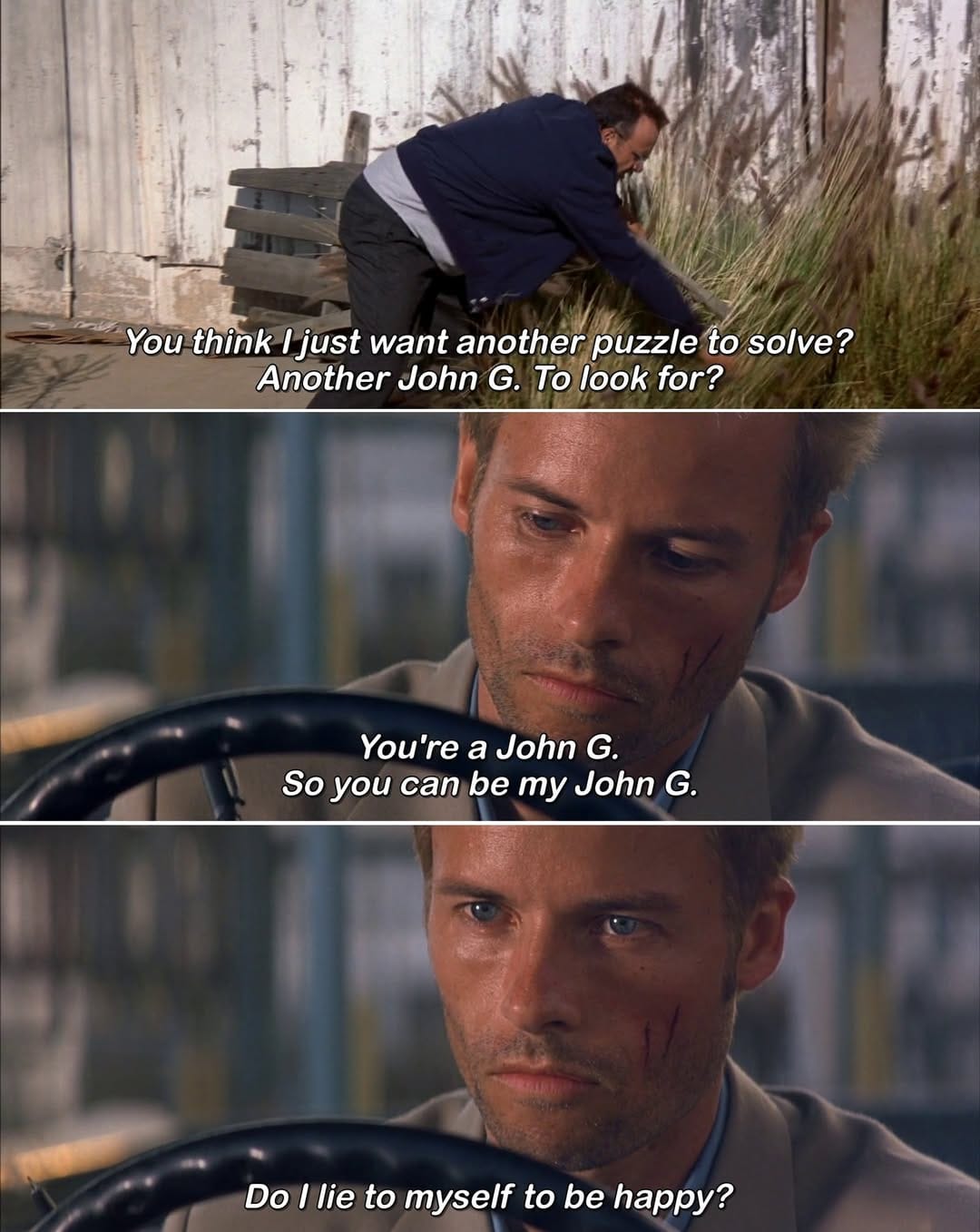 And he also is a lie. Teddy, who says he's been helping Leonard track John G., admits that he's convinced Leonard to kill multiple men (apparently drug dealers) that he convinced Leonard were the man he was looking for. Because Leonard can't remember those murders, Teddy can continue using Leonard as a perfect, oblivious hitman.