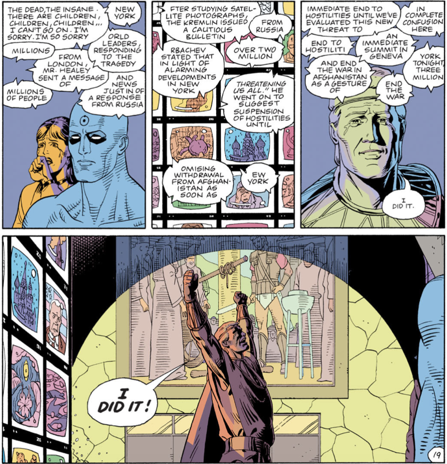 Don't let that fool you. Ozymandias may succeed in temporarily getting the leaders of countries around the world to stop fighting amongst themselves and begin preparing to defend against planetary threats, but it costs millions of innocent lives. He just believes that he's killing fewer innocent people than global nuclear war would.