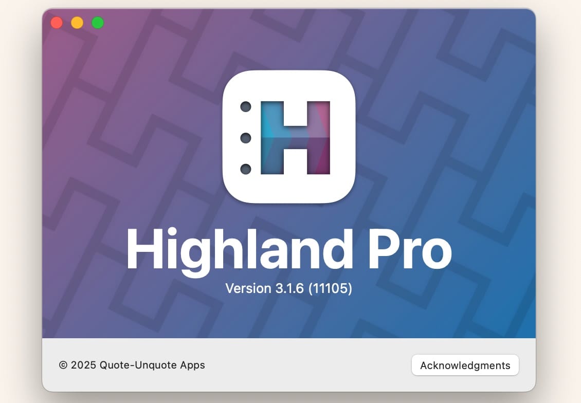 So we bit the bullet and decided to name this new app Highland Pro, continuing in the tradition of apps like Logic Pro and Final Cut Pro. The version number is still there, but only if you look for it in the About Highland... screen.