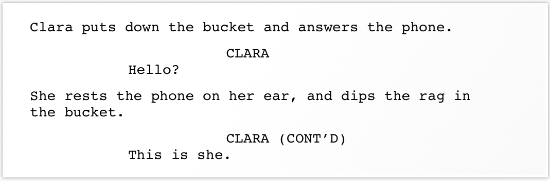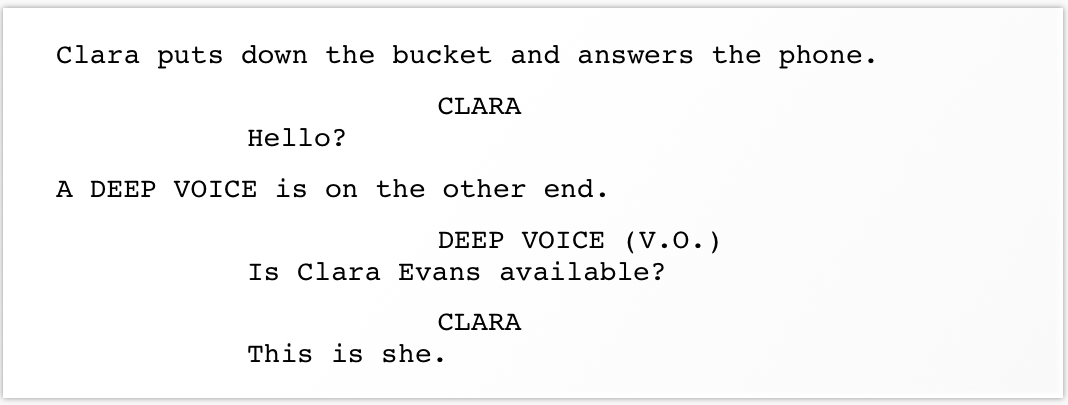 If one party is seen and the other is heard but not seen, indicate the unseen’s dialogue as voice-over (V.O.) and treat it like any other scene.