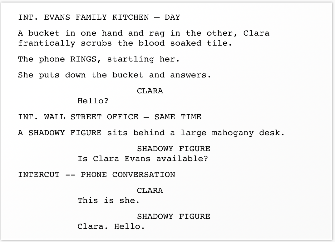 If we are cutting between the two locations (called “intercutting”), and both parties are seen, there are two clean ways to handle this. You can use the slugline “INTERCUT — [LOCATION 1]/[LOCATION 2],” or you can establish each location with its own slug and description, and then use the slug “INTERCUT — PHONE CONVERSATION” or some other clear variation. Another option is to have a full scene header between each cut. This can get unruly, but it is perfectly acceptable.