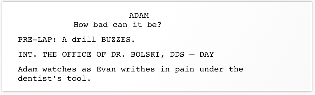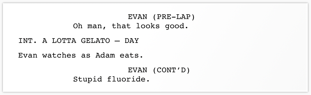 A pre-lap is when the dialogue (or any sound) from the next scene starts before we cut away from the previous scene. They are a common and useful transition. Pre-laps are often inserted in editing, but they can also be written into scripts.