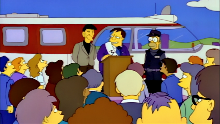 At first Marge is displeased that her call to rebuild Main Street failed against a song-and-dance routine, but her conflict with the monorail deepens after Homer sees a commercial encouraging people to apply to become the monorail’s conductor. Suddenly, becoming a Monorail Conductor becomes Homer J. Simpson’s lifelong dream.